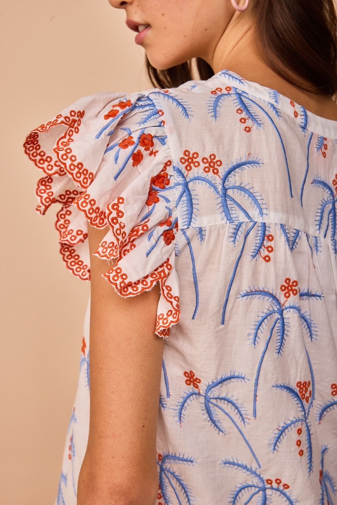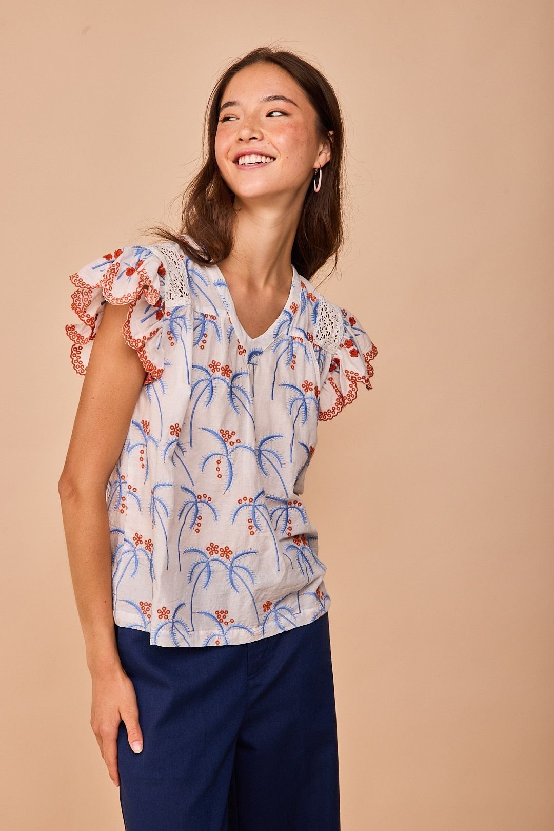 Blusa de algodón con palmeras bordadas, una pieza fresca y delicada que combina artesanía y aire veraniego. Confeccionada en un tejido ligero y suave, presenta un bordado de palmeras en tonos azules con pequeños detalles en contraste, que aporta textura, profundidad y un encanto especial a la prenda.
