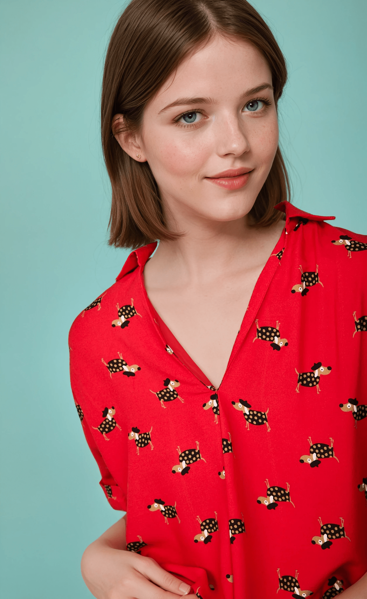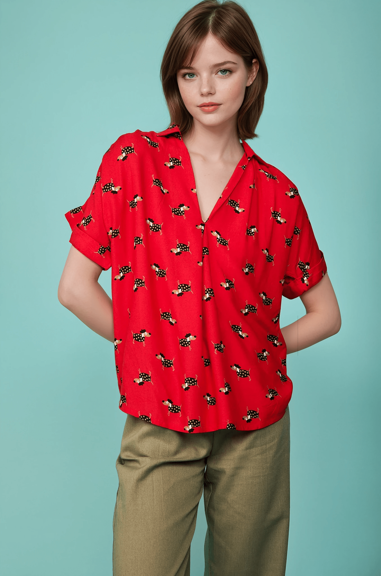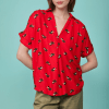 El estampado original sobre fondo rojo añade personalidad y dinamismo a la prenda, convirtiéndola en una opción ideal para quienes buscan blusas diferentes que marquen la diferencia sin renunciar a la versatilidad.