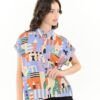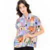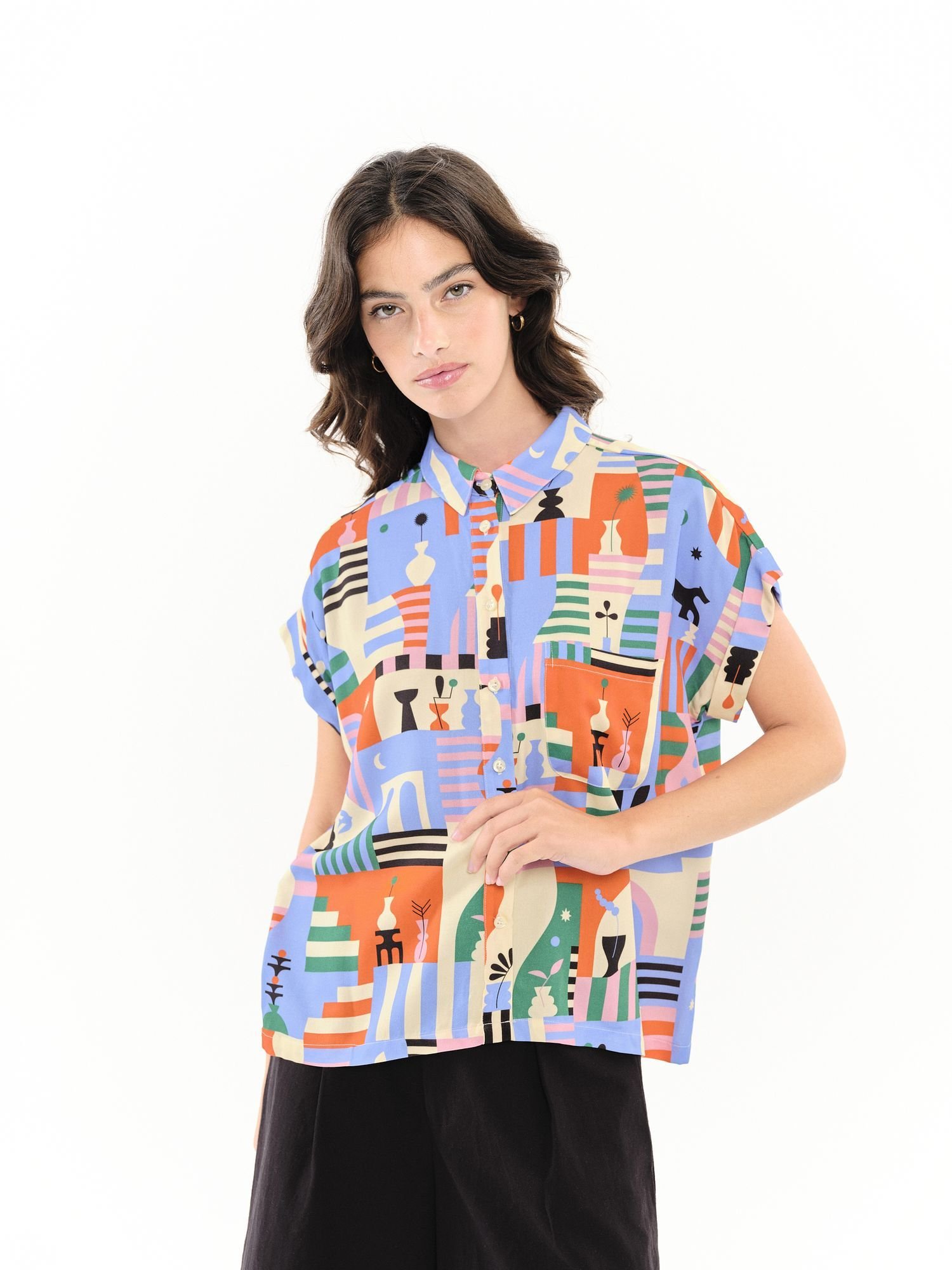 Camisa de corte relajado confeccionada en un tejido ligero y suave, ideal para los días en los que buscas comodidad sin renunciar al estilo. Su estampado geométrico de inspiración artística, con una cuidada combinación de tonos suaves y contrastes equilibrados, aporta un aire moderno y muy personal a la prenda.