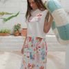 Camiseta crop sin mangas en color blanco, con ilustración frontal de nadadoras de estilo veraniego y divertido.