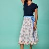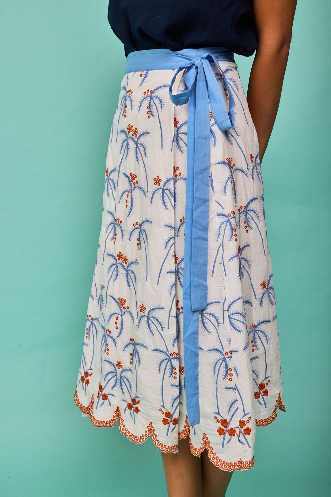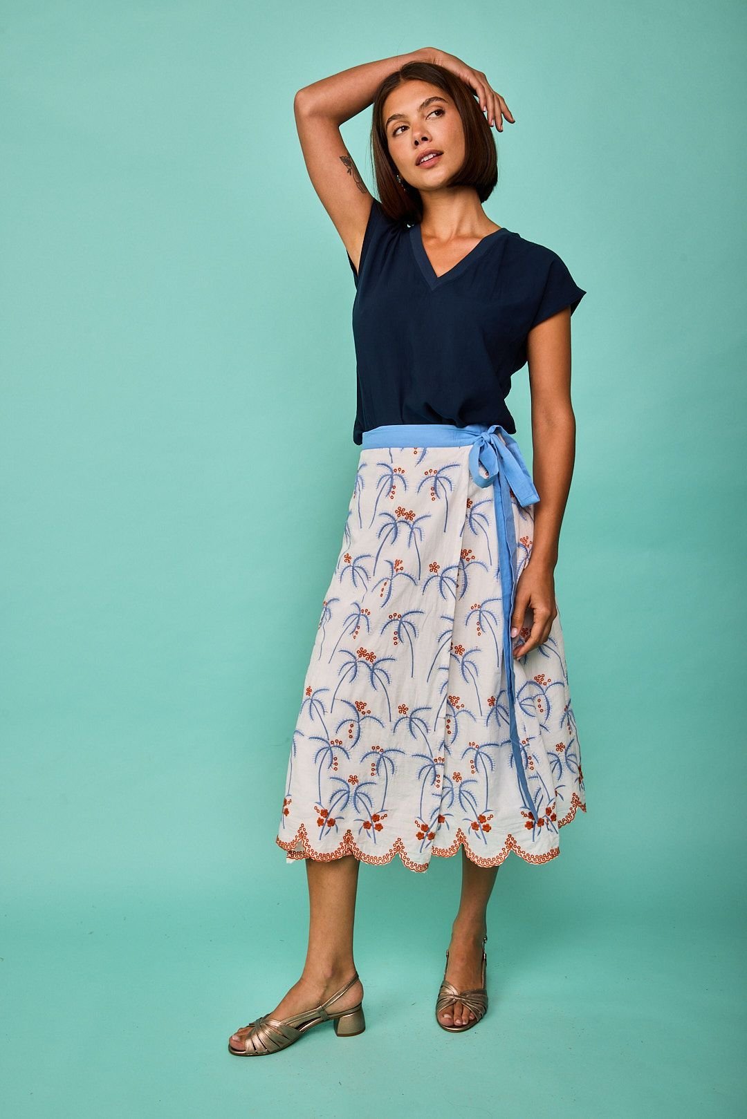 Descubre la Falda midi bordada palmeras en Glüsshop, tienda de ropa online y tienda física situada en la ciudad de Murcia, especializada en moda original, colorida y diferente para mujer.