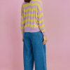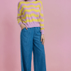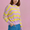 Jersey de punto ligero con diseño calado y original estampado de rayas onduladas en tonos pastel, ideal para aportar color y frescura a tus looks de entretiempo. Su combinación de rosa suave y amarillo crea un efecto luminoso y muy favorecedor.