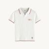 Polo de manga corta confeccionado en punto fino canalé, que aporta textura, elasticidad y un ajuste cómodo sin perder estructura. Su diseño en color blanco roto le da un aire limpio y luminoso, perfecto para looks veraniegos y estilismos relajados pero cuidados.