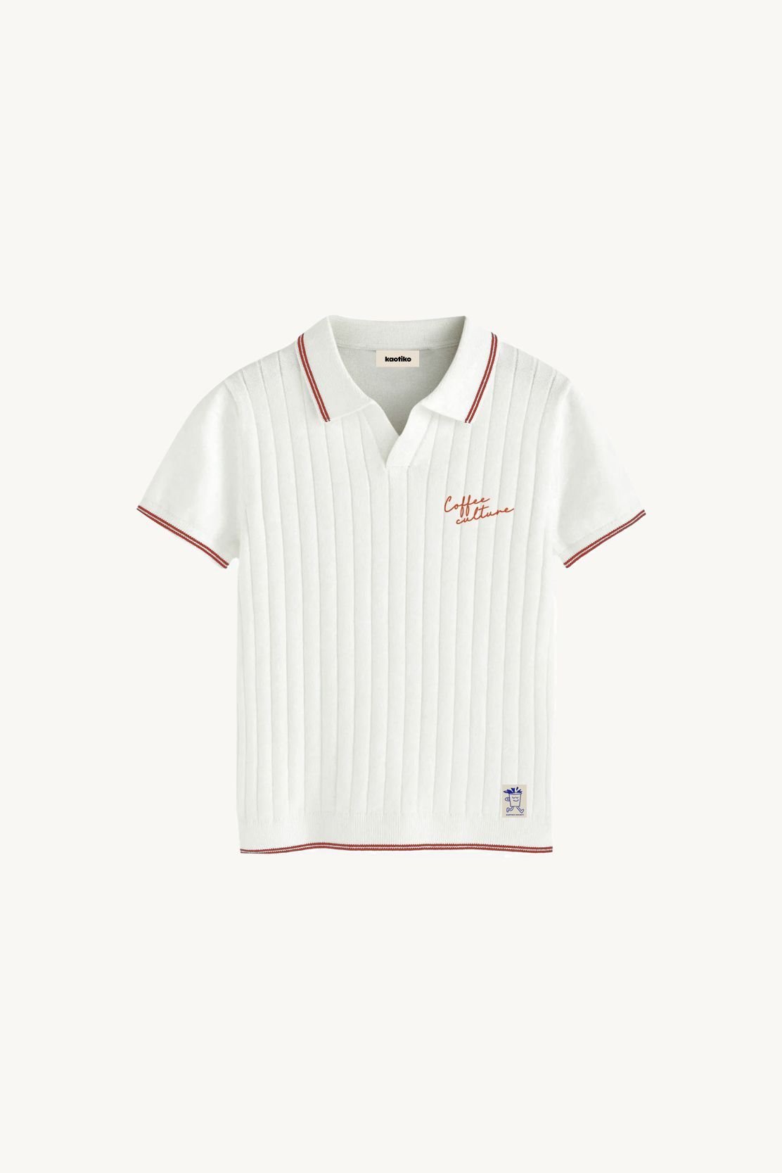 Presenta cuello tipo polo sin botones, con un acabado minimalista que refuerza su estética retro-deportiva. Los ribetes en contraste rojo en cuello, mangas y bajo añaden un toque gráfico sutil que eleva el diseño y aporta personalidad sin resultar excesivo. En el pecho incorpora un detalle bordado con el texto “Coffee culture”, discreto y elegante, que conecta con la identidad creativa de la prenda. En la parte inferior se completa con una etiqueta textil cosida, aportando un acabado de calidad.