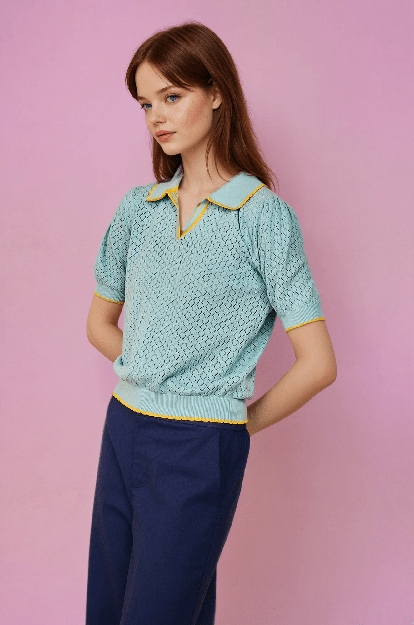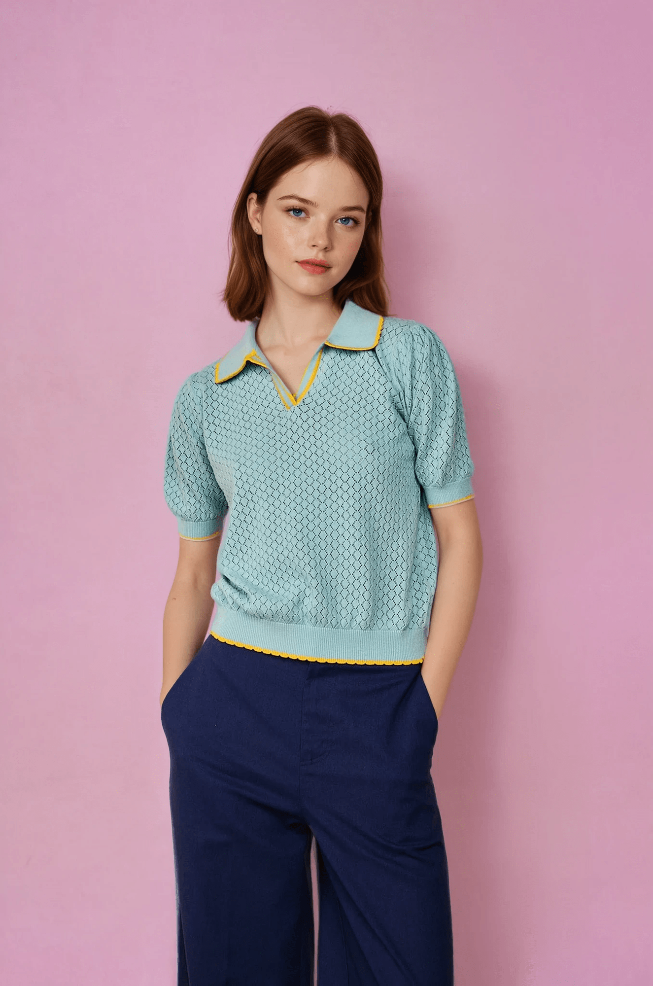 Descubre el Polo de punto calado turquesa en Glüsshop, tienda de ropa online y tienda física situada en la ciudad de Murcia, especializada en moda original, colorida y diferente para mujer.