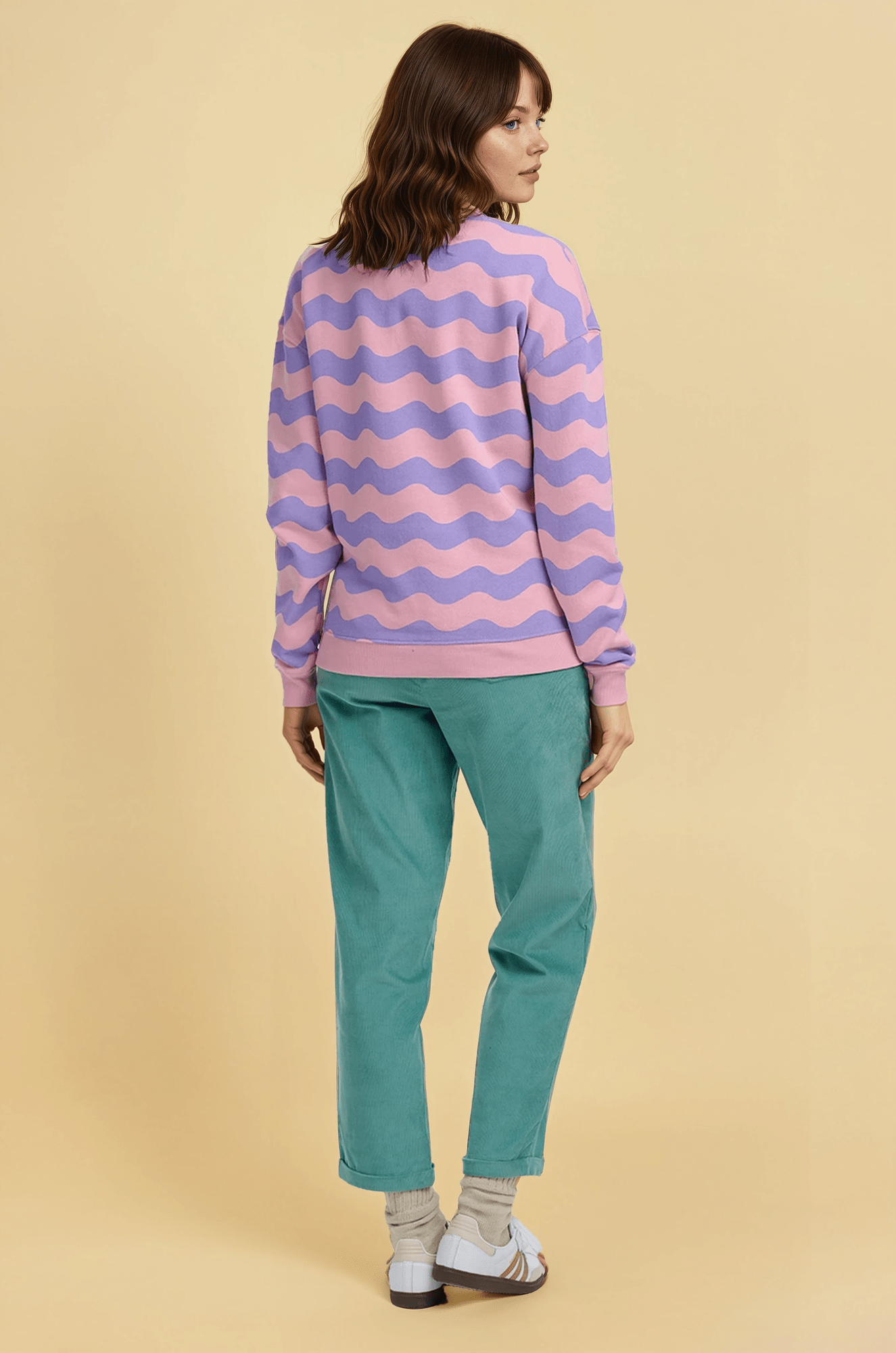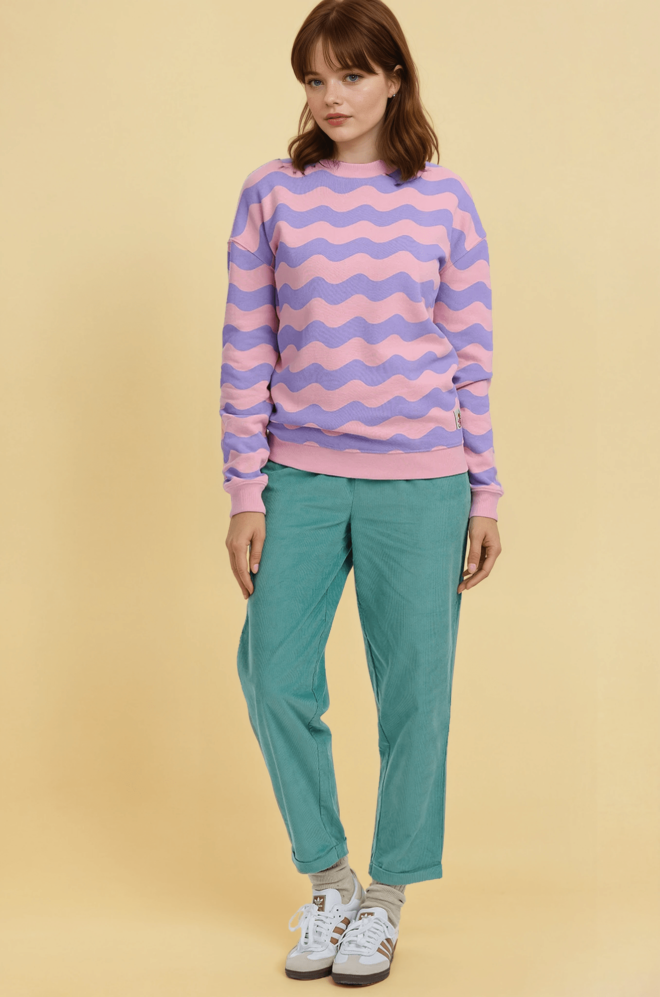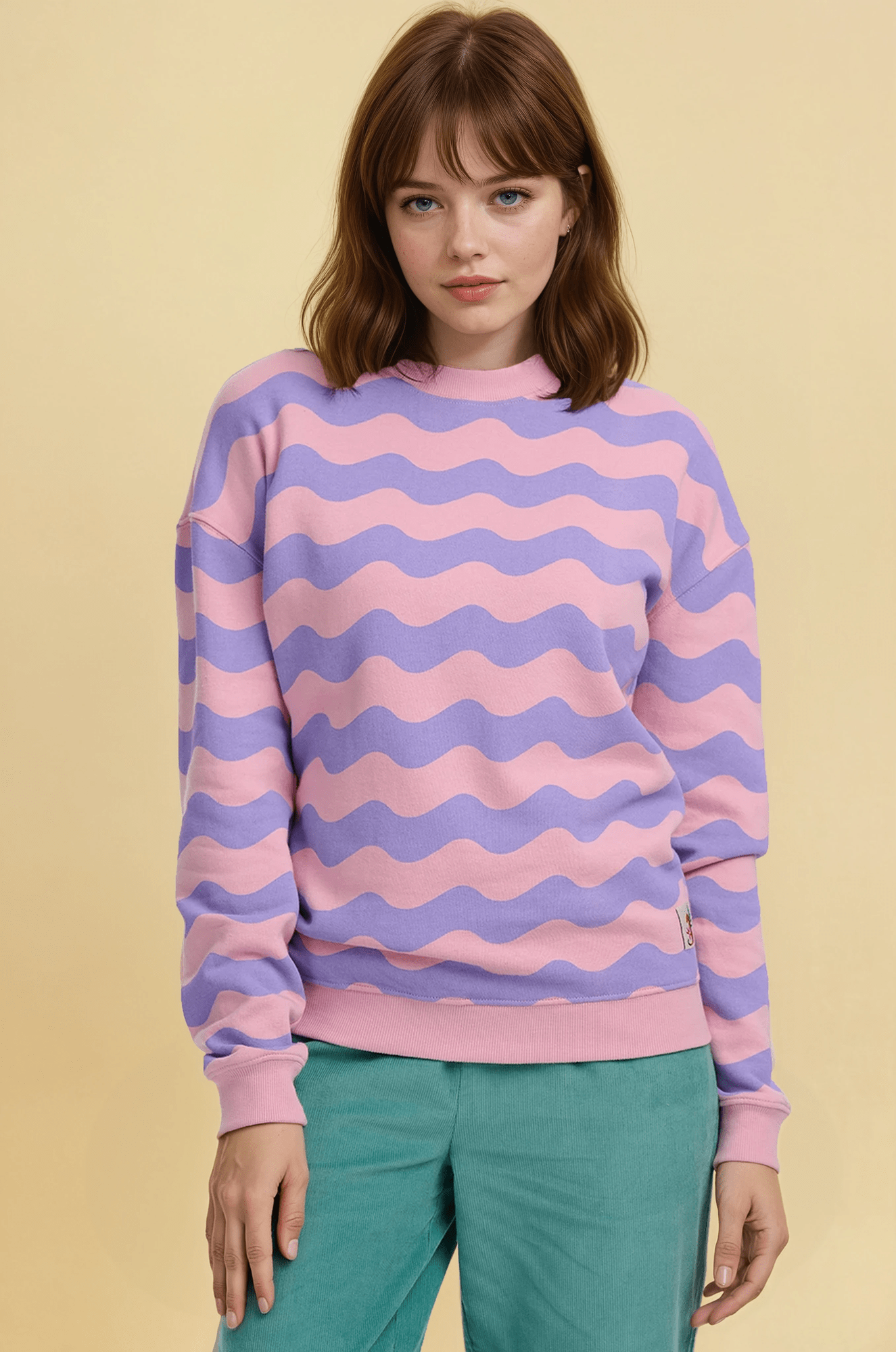 Sudadera de manga larga con un original estampado de ondas en tonos rosa y lila que aporta un aire alegre, creativo y muy actual. Su diseño combina suavidad visual y personalidad, convirtiéndola en una prenda protagonista dentro de cualquier look casual.
