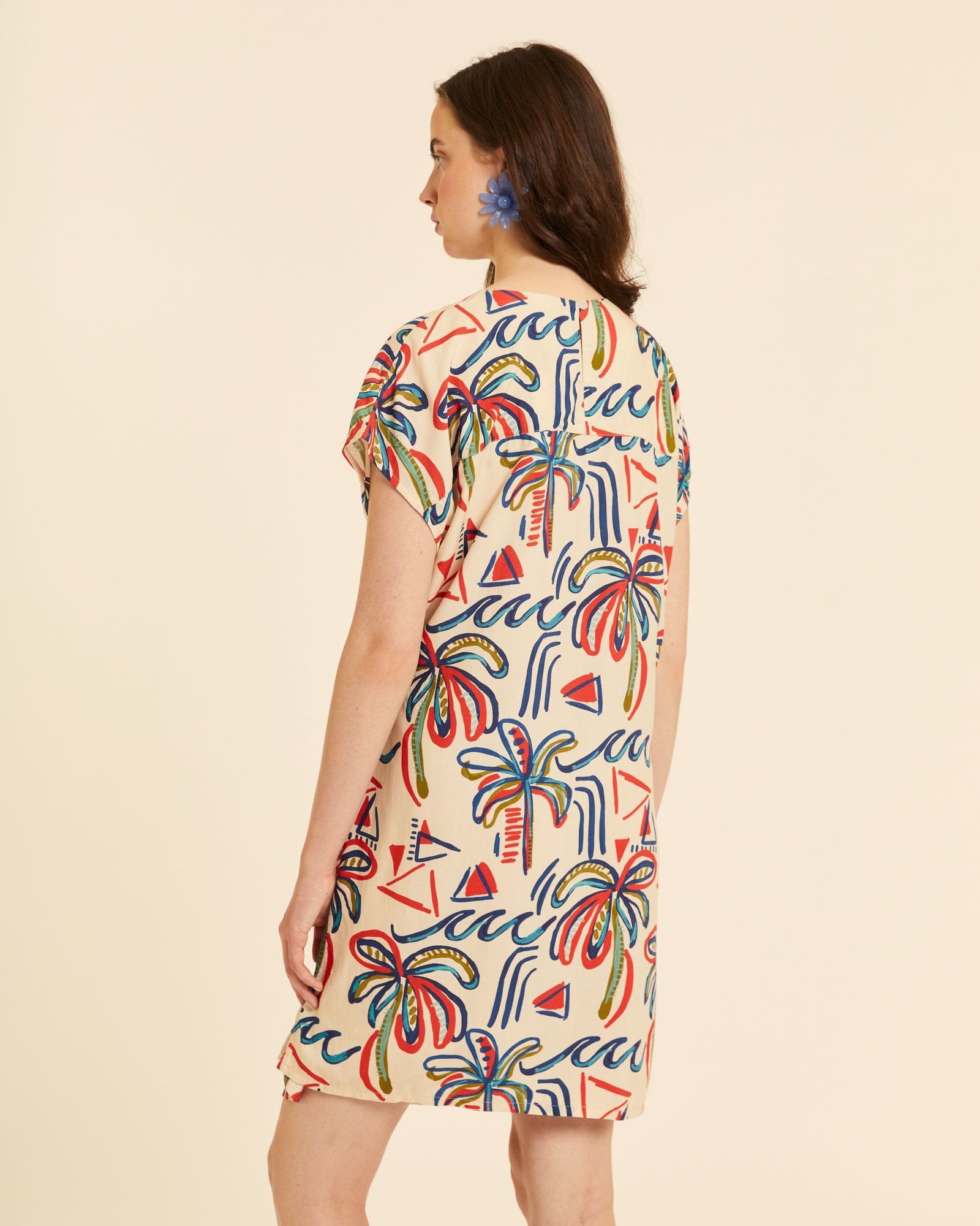 Vestido corto de estampado multicolor, con manga corta y detalle de lazada lateral que realza la silueta. Tejido ligero y fluido, cómodo y fresco, perfecto para looks de verano con un toque original.